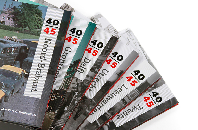 René Kok en Erik Somers van het NIOD verzamelden en selecteerden de vaak nog onontdekte beelden. Bij het vormgeven van Het grote 40-45 boek zochten we voortdurend naar het beste ‘ritme’ van het boek: Welke foto lichten we eruit? Welk beeld geven we weer als spread? We kozen ervoor om veel foto’s paginavullend weer te geven: doordat je zo veel details kunt zien – een bloem, het puin van een voorgevel, een gehaaste voorbijganger in de achtergrond – kruip je als het ware in het beeld. Het resultaat is dat je, wanneer je het boek doorkijkt, bijna zelf ervaart en voelt hoe het alledaagse leven van gewone mensen in oorlogstijd was.